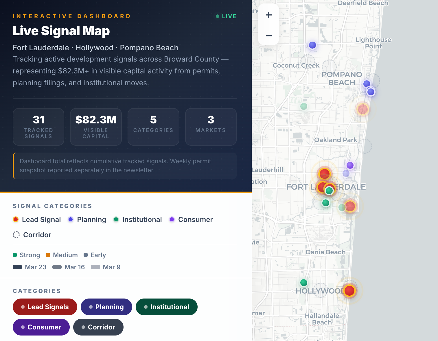 We’ve built a fully interactive dashboard of 31 projects we’re tracking right now across Fort Lauderdale, Hollywood, Pompano Beach, and the corridors in between, representing $82.2 million in visible capital activity.